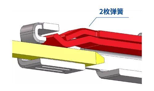 公端子采用2枚彈簧的結(jié)構(gòu)。這比單片彈簧的接觸力高,有抑制來(lái)自外部振動(dòng)影響的效果。