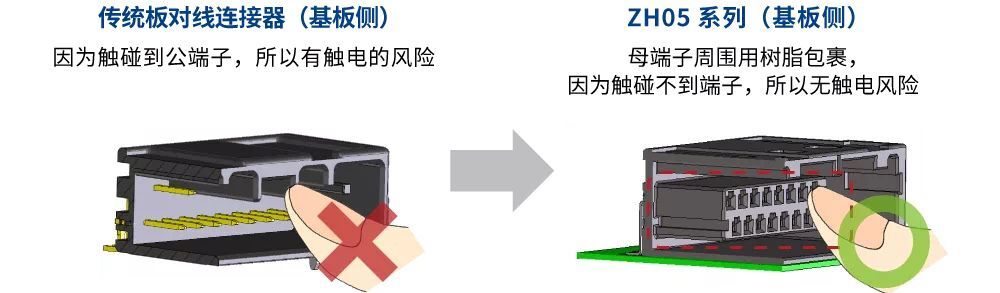 隨著電池生產(chǎn)數(shù)量的增加對(duì)安全性的要求 一般監(jiān)控車(chē)載電池電壓等連接到帶電部位時(shí),使用棒狀突出的公端子作為基板端的連接器。但是,現(xiàn)有的連接器端子形狀會(huì)產(chǎn)生異物附在相鄰端子之間,從而產(chǎn)生短路的風(fēng)險(xiǎn)。而且工作人員在進(jìn)行插拔作業(yè)時(shí)接觸到端子會(huì)有觸電的風(fēng)險(xiǎn)。在世界范圍內(nèi),隨著向混合動(dòng)力車(chē)和EV(電動(dòng)汽車(chē))轉(zhuǎn)移的趨勢(shì),電池的生產(chǎn)數(shù)量不斷增加,這也意味著風(fēng)險(xiǎn)的增加,那么安全對(duì)策就成為了當(dāng)務(wù)之急。 創(chuàng)造性的結(jié)構(gòu),確保高安全性 為了滿足這樣的需求,“ZH05”在追求車(chē)載品質(zhì)和防止觸電這兩點(diǎn)上進(jìn)行了開(kāi)發(fā)。板對(duì)線連接器采用箱型的公端子,用樹(shù)脂將端子周?chē)锢硇园鼑怪^緣,并實(shí)現(xiàn)了即便有異物進(jìn)入也不會(huì)造成短路,工作人員不會(huì)觸摸到端子的革新化的防觸電結(jié)構(gòu)。另外,采用了公端子獨(dú)有的雙彈簧結(jié)構(gòu),確保了適合車(chē)載內(nèi)部連接使用的耐熱性及耐振動(dòng)性,從而完成了高可靠性的連接器。并且,由于在電池方面,電池的容量很重要,所以也追求其小型化,這就是“ZH05”。 防觸電車(chē)載用板對(duì)線連接器“ZH05” (1) 基板端連接器的公端子周?chē)脴?shù)脂包圍的防觸電構(gòu)造。