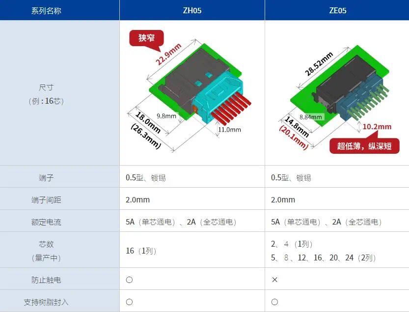 與車(chē)載電池內(nèi)部連接用連接器ZE05系列比較