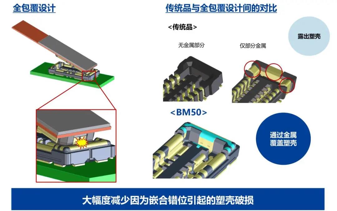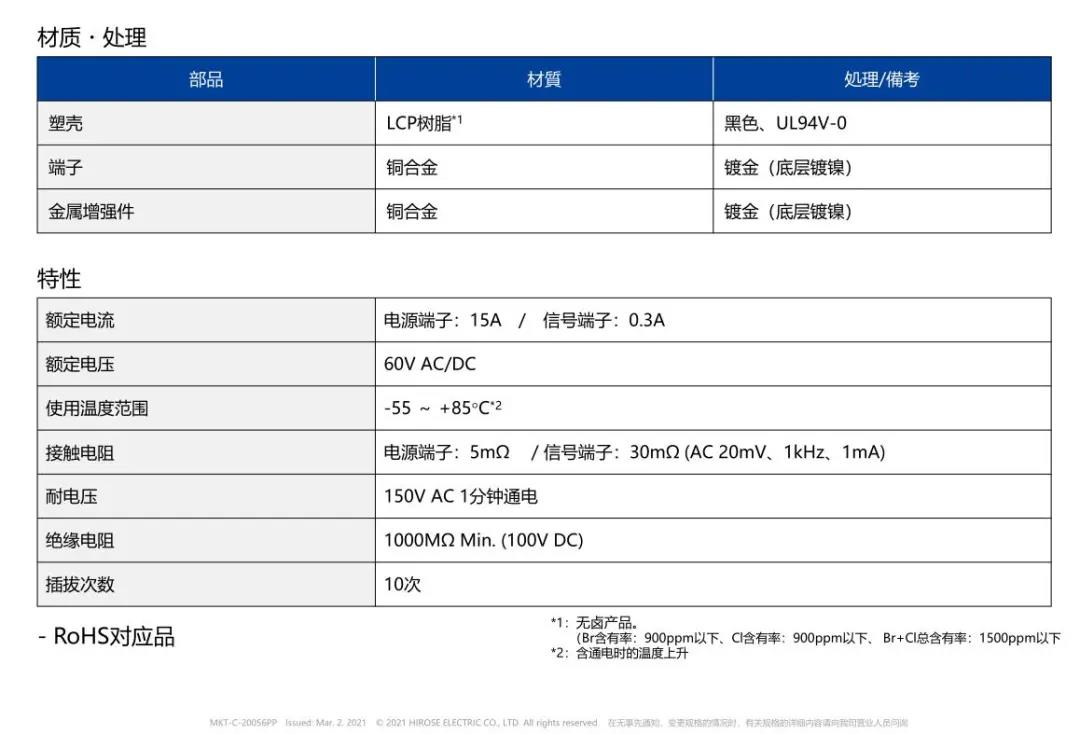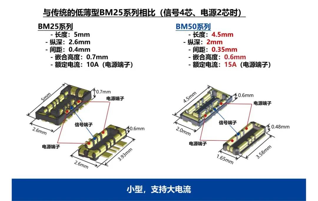 特點 1 兼顧供電能力和小型化的設(shè)計 - 額定電流:支持電源端子15A、信號端子0.3A - 嵌合高度:0.6mm、縱深:2.0mm 2 通過全包覆構(gòu)造,確保高牢固性 3 使接觸電阻最小化,節(jié)省電力 4 實現(xiàn)小型,高抜出力 5 互相夾緊型多觸點構(gòu)造,確保高接觸可靠性 有助于小型化&大電流化