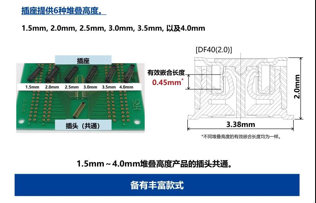 特點(diǎn) 1. 省空間:縱深3.38mm 2. 堆疊高度 1.5-4.0mm 3. 對(duì)應(yīng)USB4 Gen.2(10Gbps)信號(hào)傳輸 *1 4. 有效嵌合長(zhǎng)度長(zhǎng):0.45mm 5. 卓越的端子構(gòu)造實(shí)現(xiàn)了明確的鎖扣手感以及大嵌合力 6. 防止端子變形構(gòu)造 7. 種類繁多(帶護(hù)罩:DF40G系列,帶完全鎖:DF40GL系列,ADAS:DF40T系列) 8.核心數(shù)量從10到120核心變化巨大 9.用導(dǎo)向肋確保自動(dòng)對(duì)準(zhǔn):0.33mm 10.防止鎳阻擋層焊接的結(jié)構(gòu) 11.還提供用于生產(chǎn)線檢查的高度耐用的連接器* 只有H=1.5 mm的產(chǎn)品支持Type-C DF40系列變體